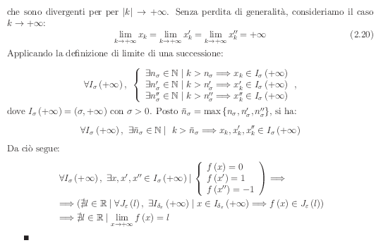 Non è possibile nemmeno la divergenza, per le ragioni viste sopra. Ad esempio se fosse f(x)->+oo, dovrebbe essere f(x) maggiore, definitivamente, di un qualunque numero reale positivo (arbitrariamente grande). Ma ciò non è possibile, proprio perchè la funzione assume valori minori di quel numero assegnato.