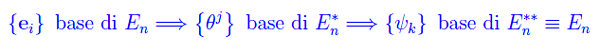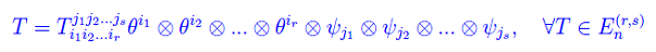 i cui elementi sono i tensori misti di rango r+s. Ci proponiamo di stabilire la legge di trasformazione di tali enti in seguito a un cambiamento di base nel predetto spazio. A tale scopo, osserviamo innanzitutto che un cambiamento di base nello spazio vettoriale, per così dire, di partenza ossia E_{n}, induce un cambiamento di base nel duale e nel biduale e quindi, in En(r,s). Infatti, assegnare una base in En equivale ad assegnare una base nel duale e nel biduale (ove quest'ultimo si identifica con E<n a meno di un isomorfismo naturale). In simboli: