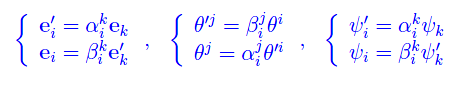 Ora non dobbiamo fare altro che scrivere le leggi di trasformazione dei vari vettori di base quando si passa da {ei} a una nuova base {ei'}. Denotando con αij e ßji gli elementi di matrice della matrice di passaggio P (dalla vecchia alla nuova base) e della sua inversa (gli indici in alto sono indici di riga), si ha: