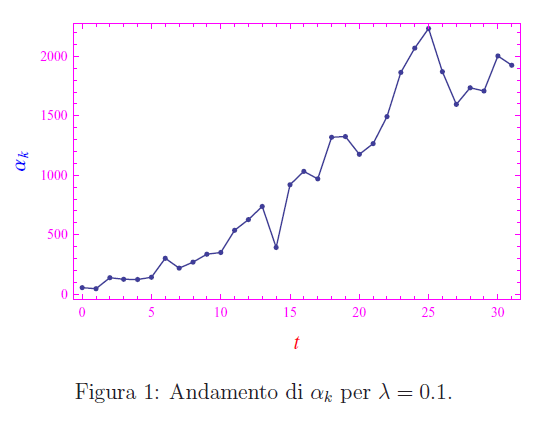 dove l'intero naturale n identifica l'istante giornaliero tn. Ad esempio, in data odierna (28/03, i dati sono aggiornati al giorno precedente) abbiamo l'andamento graficato in fig. (assumendo λ=0.1)