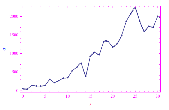 Una volta ottenuta la funzione αint(t) possiamo integrare per quadrature l'equazione differenziale scritta all'inizio. Tuttavia, per evitare problemi derivanti dal calcolo di un integrale definito di una funzione ottenuta per interpolazione, preferiamo chiedere a Mathematica di integrare numericamente la predetta equazione. In fig. 1 (top della pagina) iportiamo l'andamento della soluzione numerica confrontata con l'andamento reale della diffusione virale.