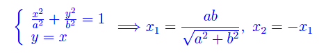 Determiniamo innanzitutto le coordinate cartesiane del punto di intersezione della retta o meglio della semiretta x=y (per y>0) e dell'ellisse: