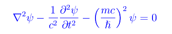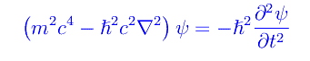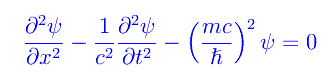 nota come equazione di Klein-Gordon. Si noti che se non ci fosse il terzo termine a primo membro, la K-G sarebbe la equazione di D'Alembert. Un'altra differenza notevole rispetto a quella di Schrödinger è che la K-G è del secondo ordine nella derivata temporale. E ciò presenterà problemi interpretativi
