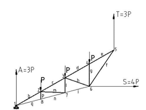 La struttura è simmetrica e caricata simmetricamente; se ne può dunque studiare solo la metà. La cerniera in alto va sostituita con una forza verticale T. L'asta centrale va sostituita dalla forza S (v. fig.)