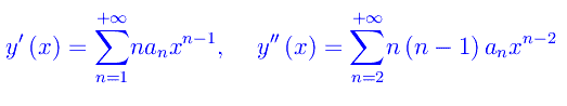 Ora non dobbiamo fare altro che derivare termine a termine per due volte, dopodiché immettere i rispettivi sviluppi in serie nell'equazione assegnata. Abbiamo: