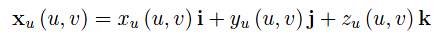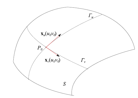Ne segue che xu(u0,v0) è un vettore tangente a Γu nel punto P0(u0,v0). In maniera simile, xv(u0,v0) è un vettore tangente a Γv nel medesimo punto, come illustrato in fig.